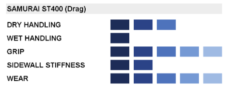 Samurai ST400 is purposefully engineered for high-performance drag racing, focusing on acceleration and top-speed handling. These tires are meticulously designed to provide exceptional traction and control in the drag strip environment.
